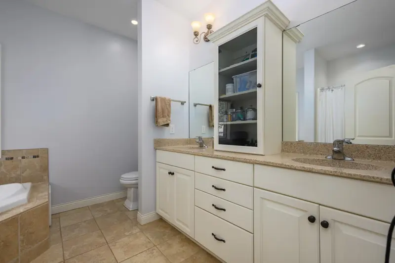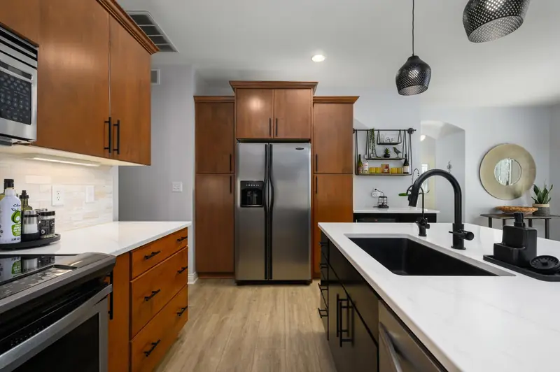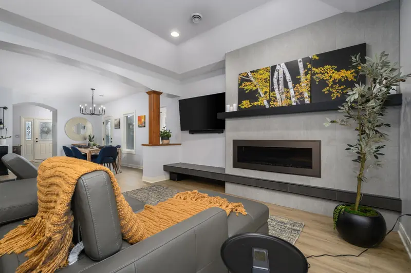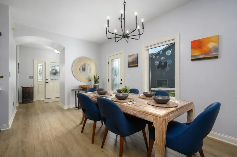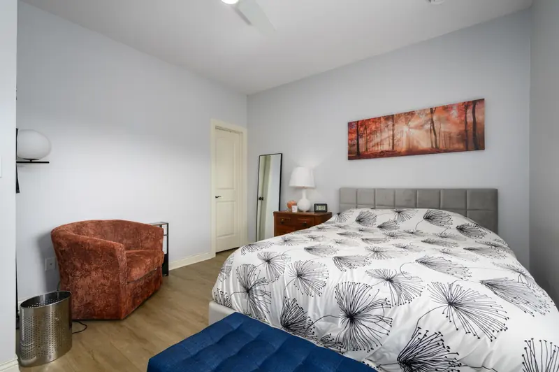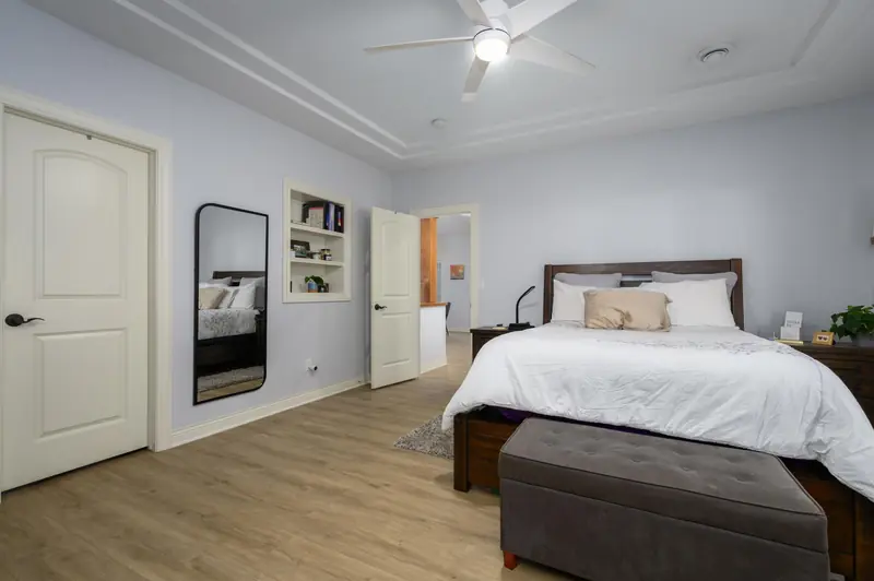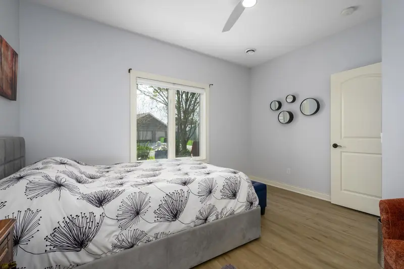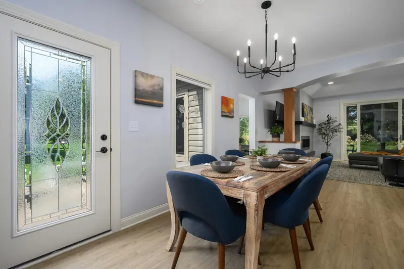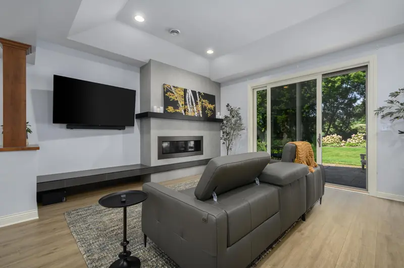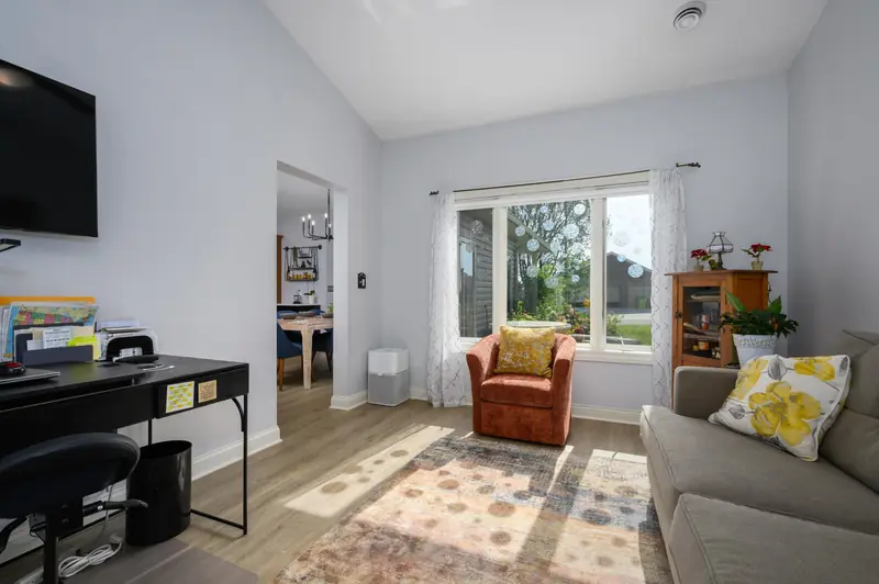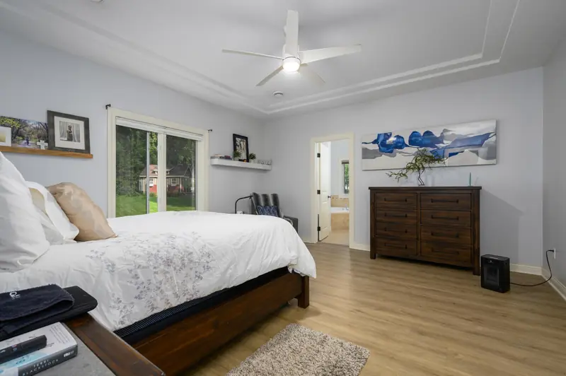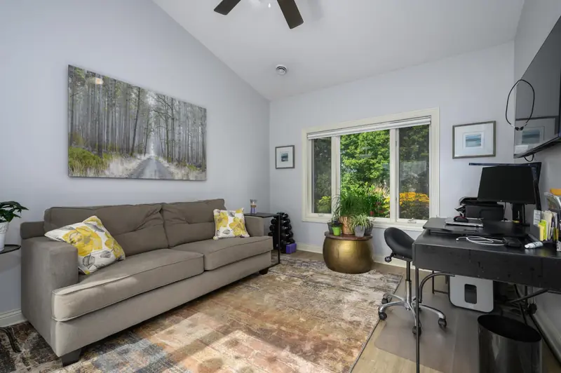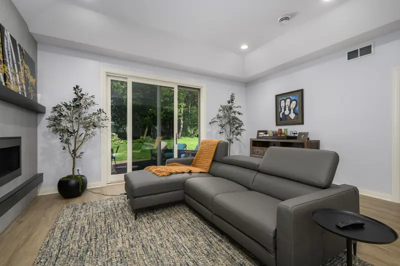 The custom kitchen features elegant countertops, designer backsplash, custom cabinetry, and high-end appliances — perfect for daily living and entertaining. Fresh paint and updated finishes flow throughout, and added sliding door opens to a flexible bonus space ideal as a third bedroom, sunroom, home office, or exercise room.